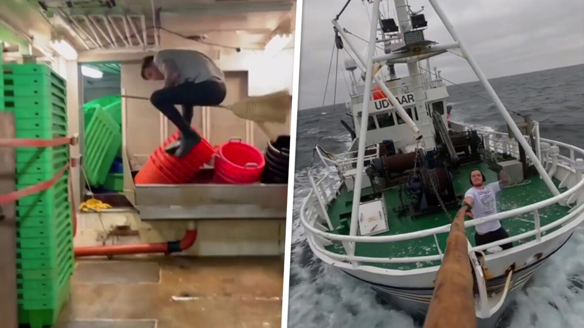 Het is niet voor het eerst dat onze vriendelijke visser heen-en-weer schuddend demonstreert dat werken op de Noordzee niet voor watjes is. Ze krijgen behoorlijk pittige golven te verduren en vervolgens helpt die altijd vervelende zwaartekracht ook niet echt mee. Heb je eigenlijk nog wat gevangen?