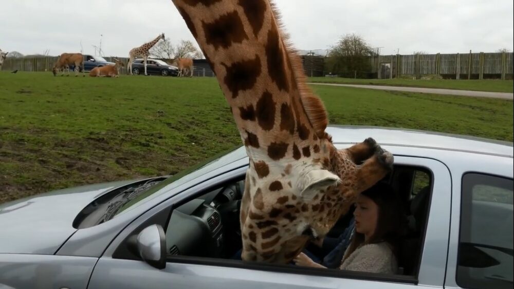 Muts doet raam dicht als de giraffe iets te dichtbij komt