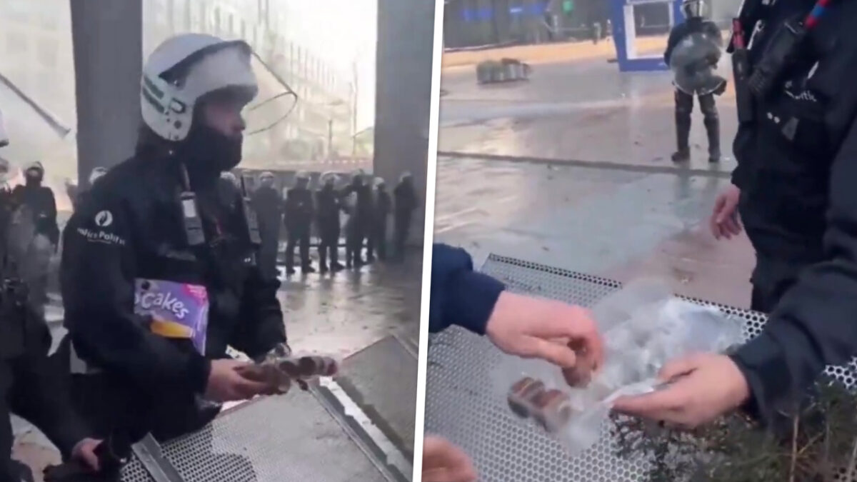 Politie laat zich tijdens boerenprotest in Brussel van beste kant zien en trakteert op koekjes