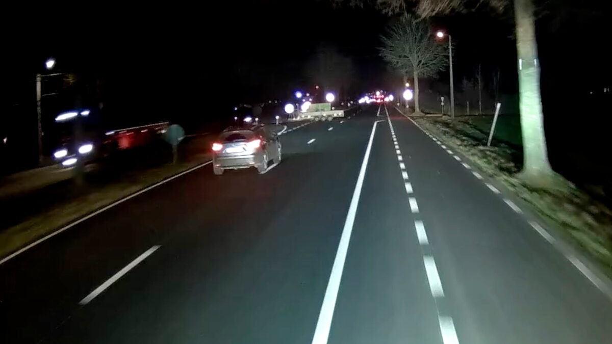 Vooropgesteld; je bent echt een enorme idioot als je in het donker met zo'n lange aanhangwagen in het midden van de weg gaat stilstaan, en al helemaal als het ook nog eens een slecht belichte weg is. Gelukkig keek deze vrachtwagenchauffeur wel fatsoenlijk uit z'n doppen en kon met groot licht de automobilist net op tijd waarschuwen.