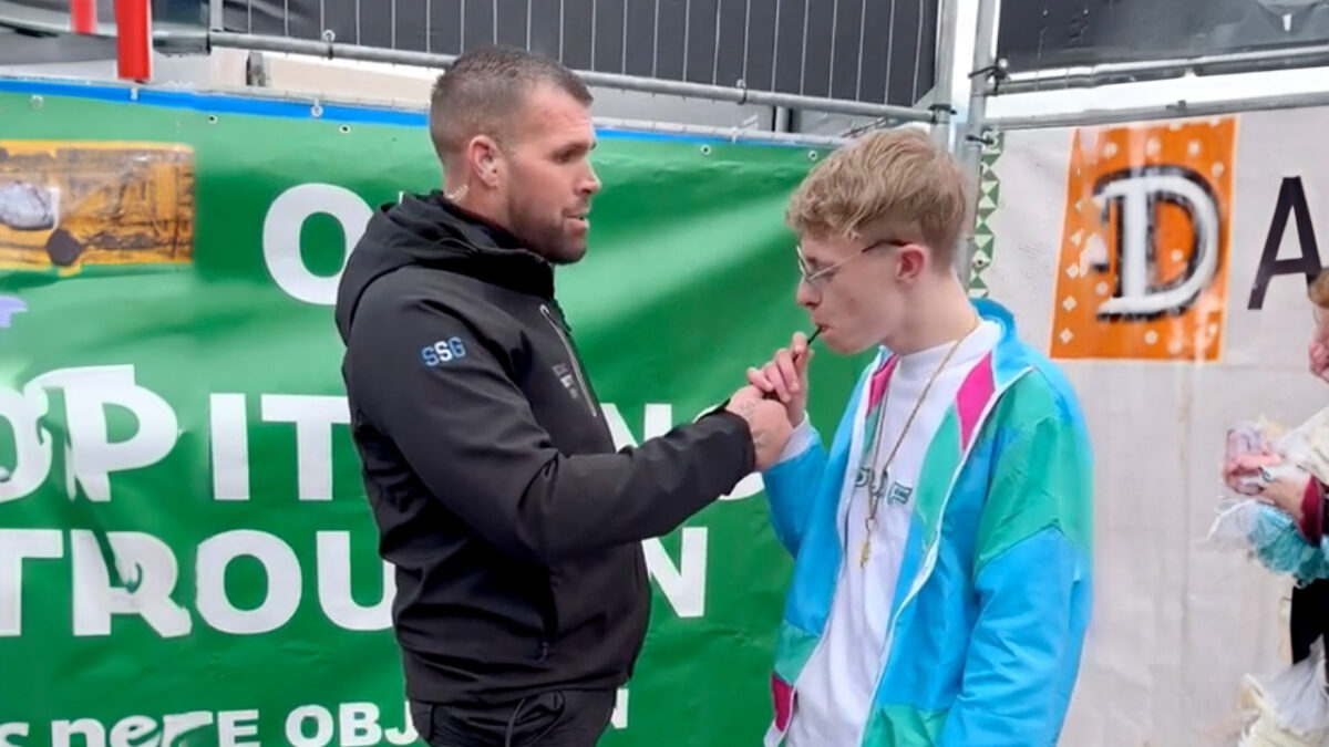 Alcoholcontrole tijdens carnaval: beveiliger laat 'm blazen op een portofoon