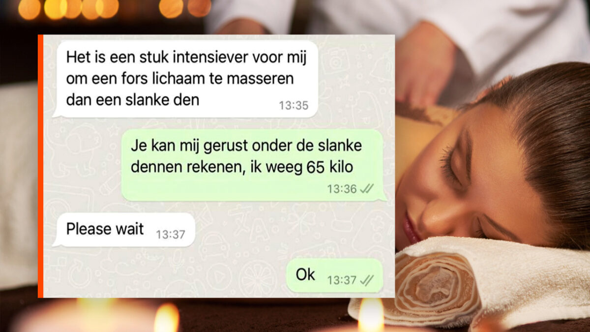 Luister vriendin, voor een masseur is het een stuk intensiever om dikke BMI-uitgedaagde mensen te behandelen, dus als je mijn uurprijs wil weten dan zul je toch echt eerst even je gewicht moeten doorgeven. Oh ja, alle prijzen zijn sowieso hoger geworden maar dat is niet mijn schuld.