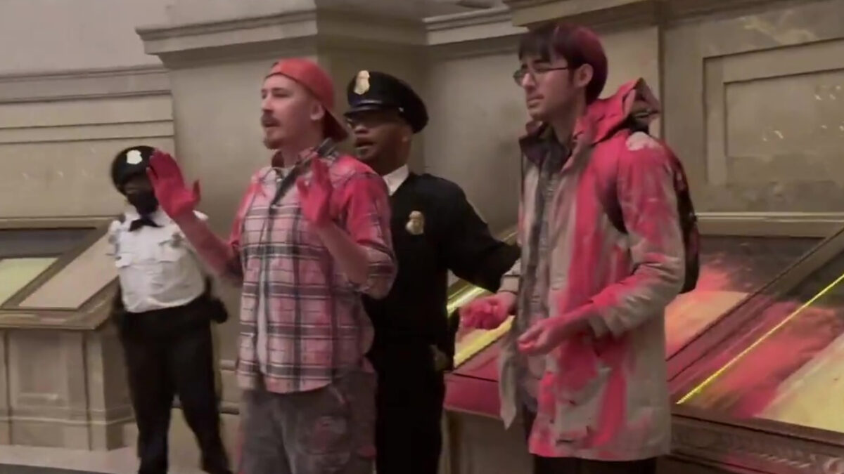 Om de een of andere reden vinden sommige klimaatactivisten dat ze zaken moeten slopen, besmeuren of op andere wijze moeten vernielen om aandacht voor hun zaak te krijgen, en zo ook in de Rotunda van de National Archives in Washington, waar twee activisten zichzelf en de hal besmeurden met rood poeder, waarbij ze vertelden dat "gelijkheid niet alleen voorbehouden zou moeten zijn aan witte, rijke mannen".