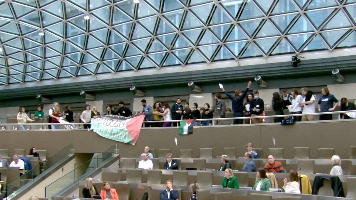 Gedoe tijdens een plenaire vergadering in het Vlaams Parlement waarbij vanaf de bezoekerstribune een 20-tal activisten met Palestijnse vlaggen zwaaiden en met pamfletten gooiden. Ze eisen een onmiddellijke stopzetting van de handel tussen België en Israël, en dan natuurlijk specifiek de verkoop en de doorvoer van wapens. De vergadering moest tijdelijk worden geschorst.