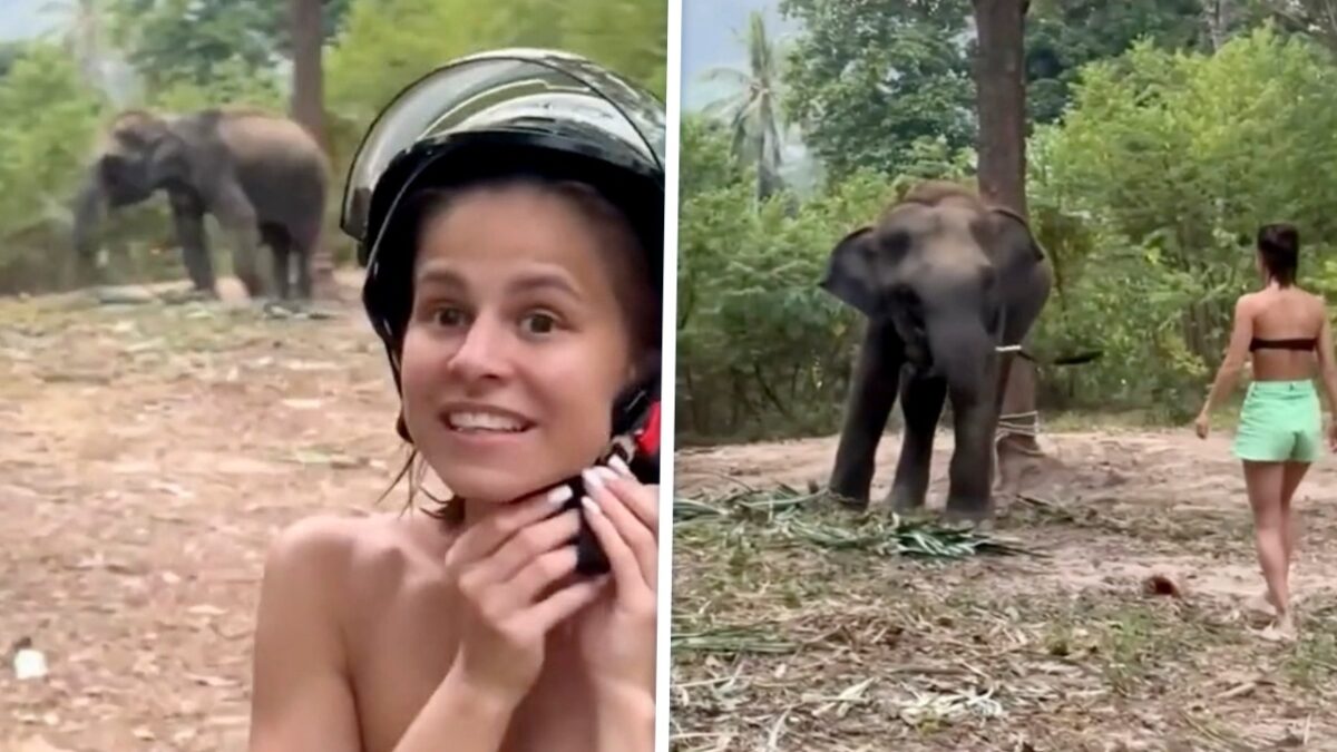 Russin wordt omver gekieperd als ze een olifant stoort tijdens het eten