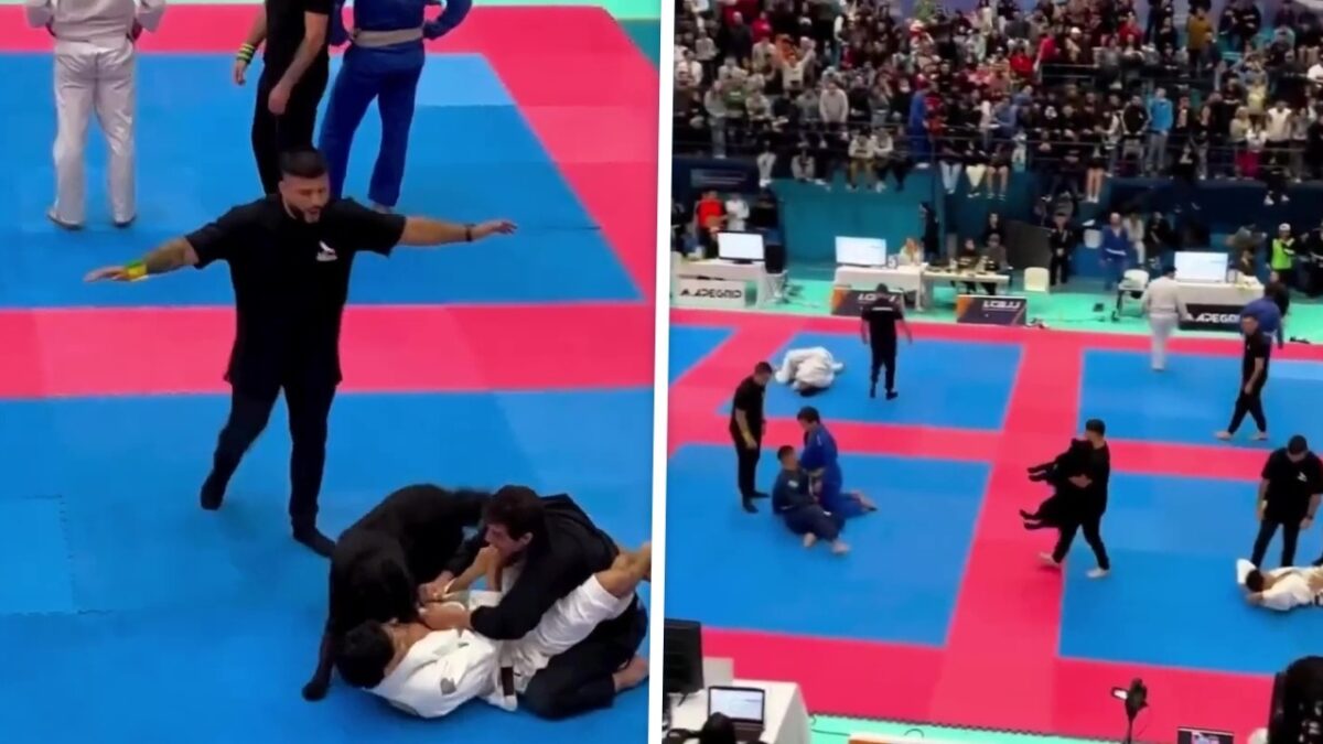 Tijdens een jiu-jitsuwedstrijd kan het natuurlijk zomaar zijn dat je op de grond komt te liggen omdat je tegenstander aan het winnen is, maar gelukkig is daar altijd nog de trouwe viervoeter die ingrijpt.