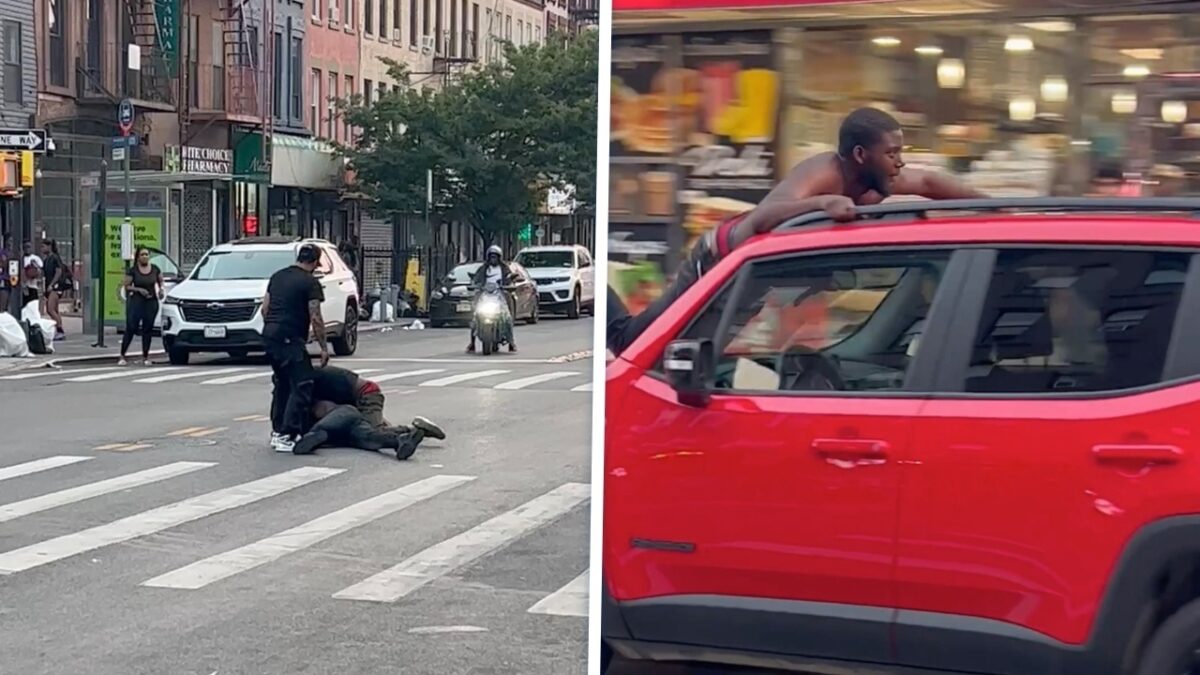 Ondertussen in New York: drugsgekkie klimt op auto en krijgt gratis ritje