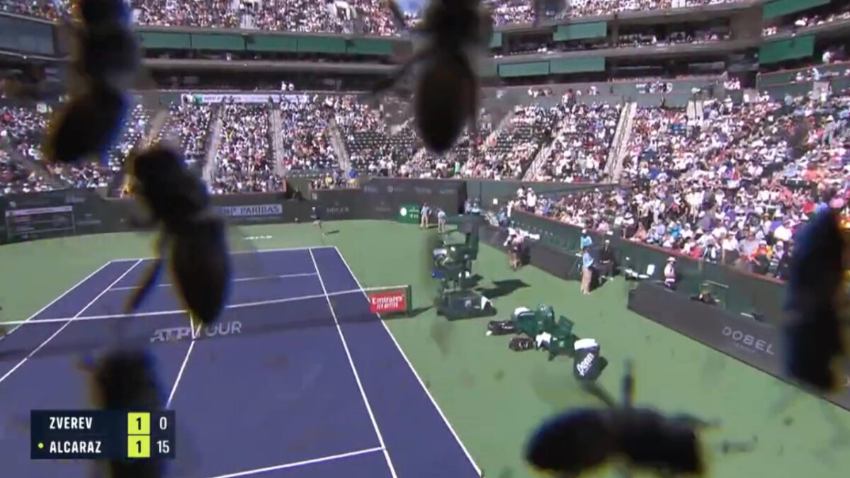 Momenteel is de Indian Wells Open in volle gang, en gisteren werd in dat Amerikaanse tennistoernooi de kwartfinale tussen Carlos Alcaraz en Alexander Zverev gespeeld. Die wedstrijd werd onderbroken en stilgelegd vanwege een wel heel bijzondere reden: een enorme zwerm bijen had besloten zich te vestigen op een camera, wat de nodige paniek met zich meenam. Het wegmeppen van de beestjes bleek zinloos en dus mochten de spelers het veld verlaten.