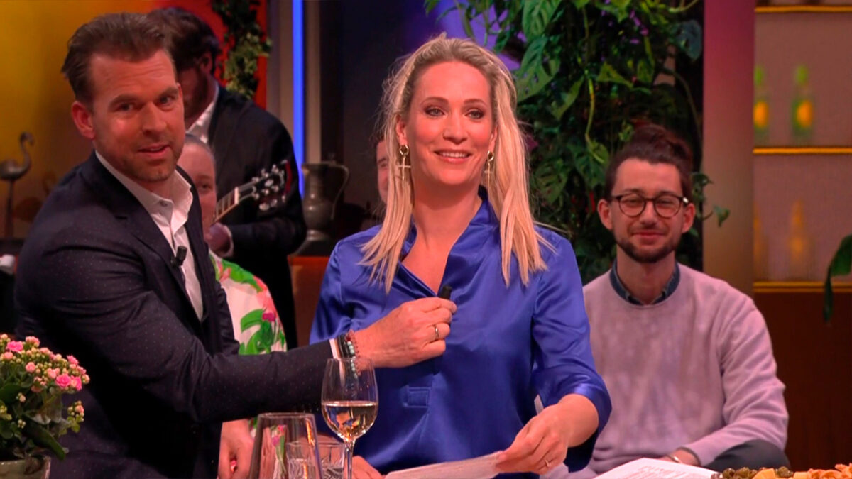 Galante Rutger Castricum helpt Hélène haar blouse dicht te doen tijdens De Oranjezondag