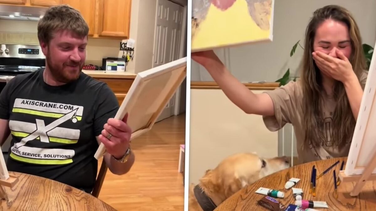 Het lijkt een bijzonder leuk plan: pak twee schildersezels, wat verf en ga tegenover elkaar zitten om elkaar eens zo kunstzinnig mogelijk na te schilderen. Werd in dit geval niet zo'n succes, al lijkt ze er wel om te kunnen lachen.