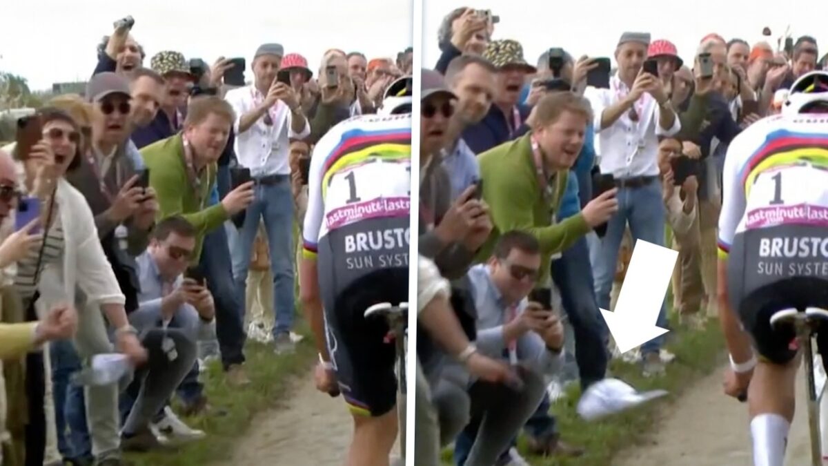 Vrouw gezocht die petje naar het wiel van Mathieu van der Poel gooit tijdens Parijs-Roubaix