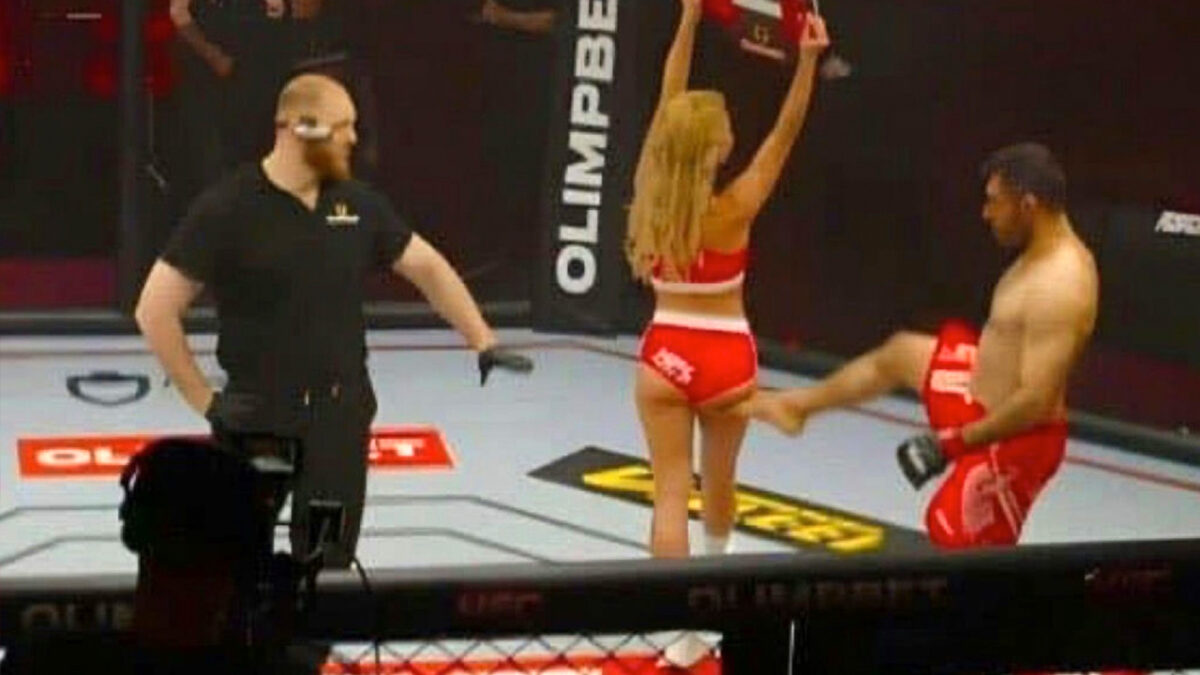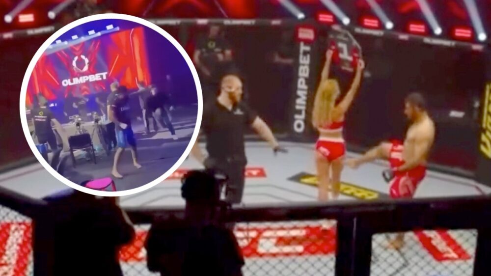 Iraanse MMA-vechter schopt ringmeisje, verliest partij en wordt door publiek in elkaar geslagen