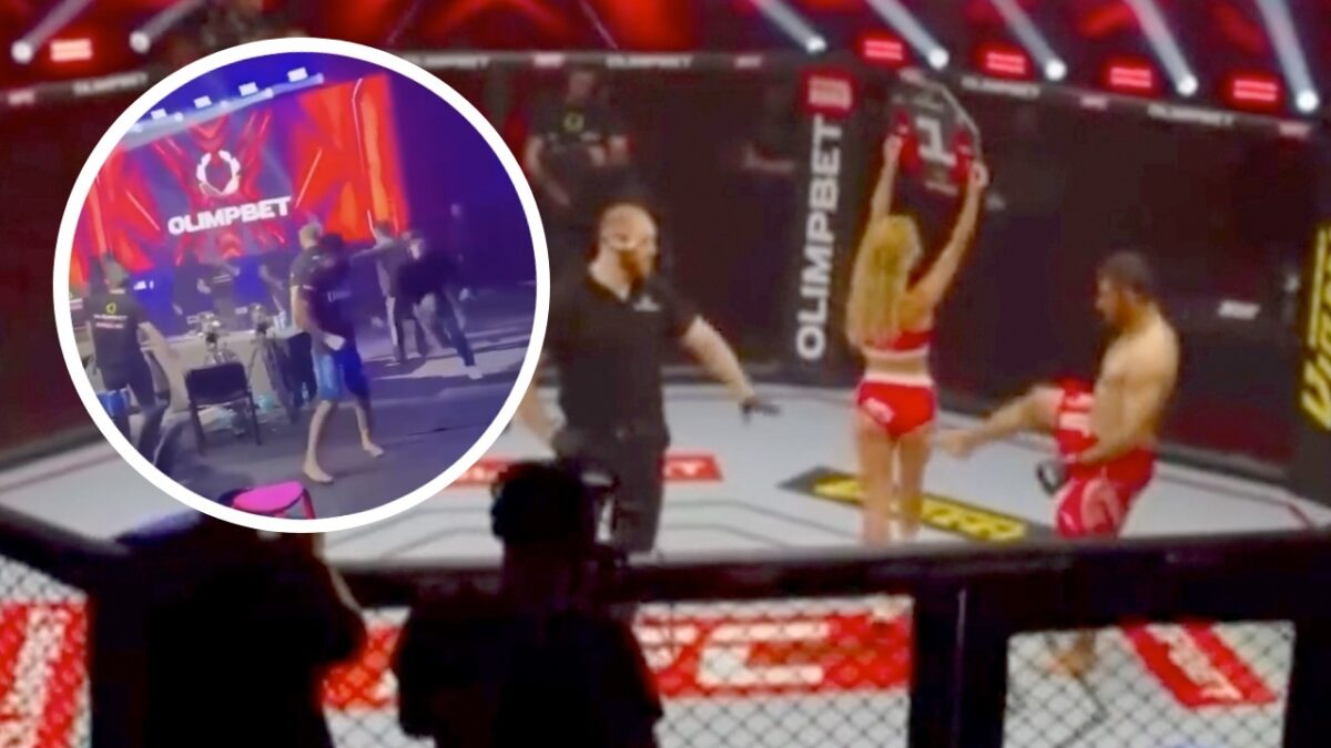 Iraanse MMA-vechter schopt ringmeisje, verliest partij en wordt door publiek in elkaar geslagen