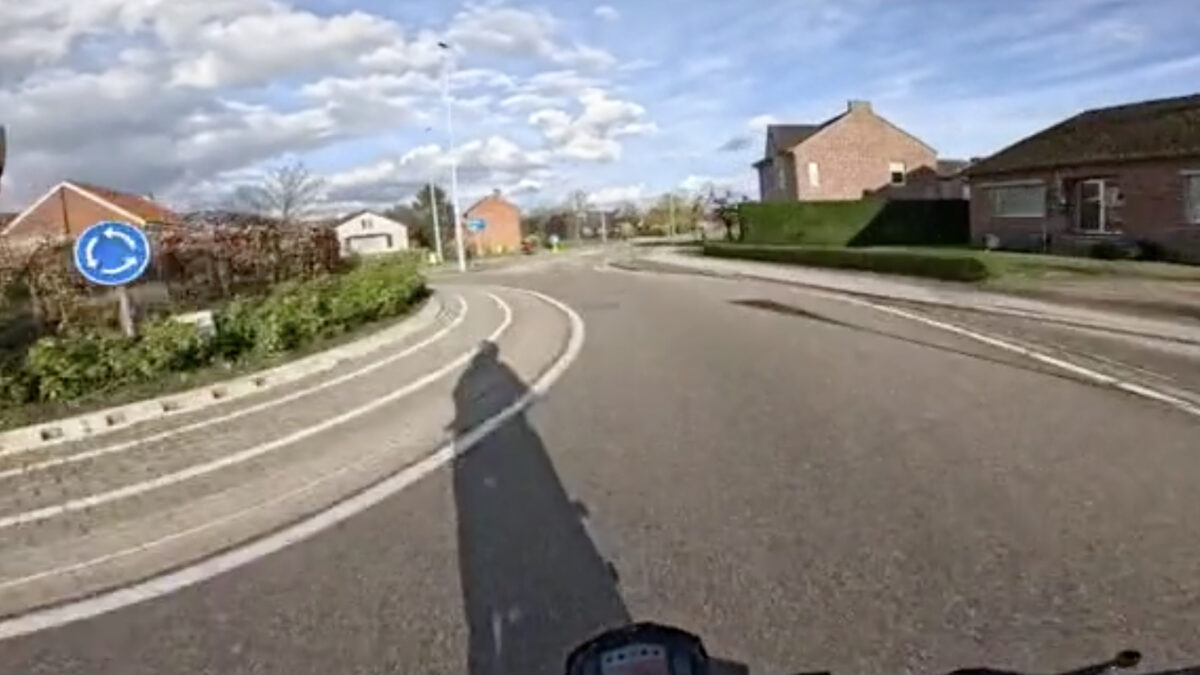 Bepaalde rotondes zijn dermate onhandig(?) gemaakt dat je niet eens zoveel hoeft af te remmen om er overheen te rijden, en al helemaal niet als je op een motor rijdt. Al nam deze motormuis iets teveel hooi op z'n vork.