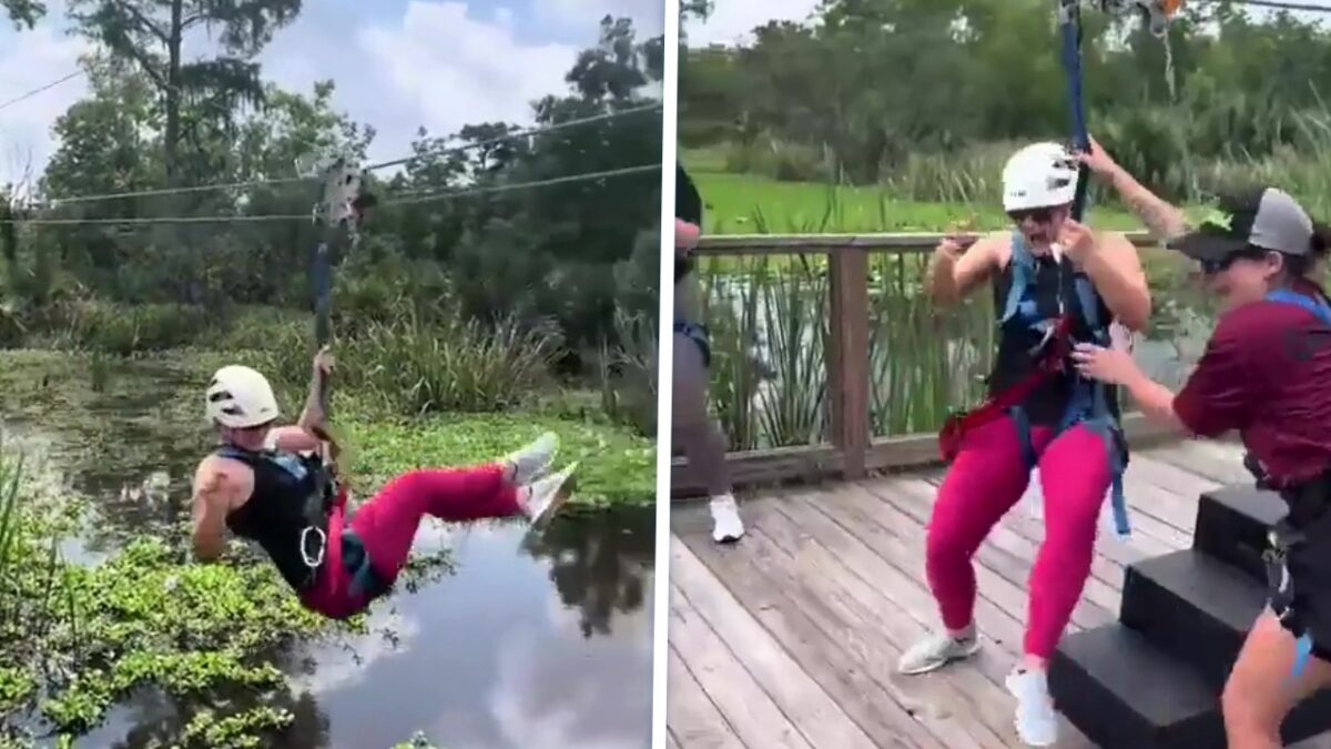 Het ritje over de kabelbaan verliep eigenlijk helemaal prima, maar na het afstappen beseft deze dame zich dat het maar goed is dat ze niet in het water viel.