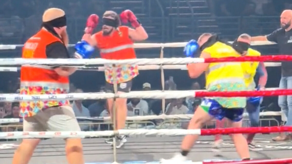 Geblinddoekt de ring in stappen om samen met je maten een wedstrijdje te boksen. Klinkt als een actie die je op een dronken zaterdagavond zou bedenken, maar blijkbaar wordt het ook door vrijwilligers uitgevoerd.