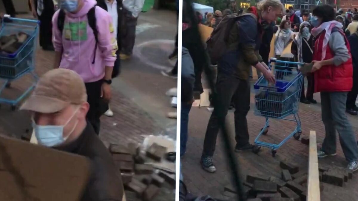 Demonstranten UvA verzamelen bakstenen "om naar politiehonden te gooien"