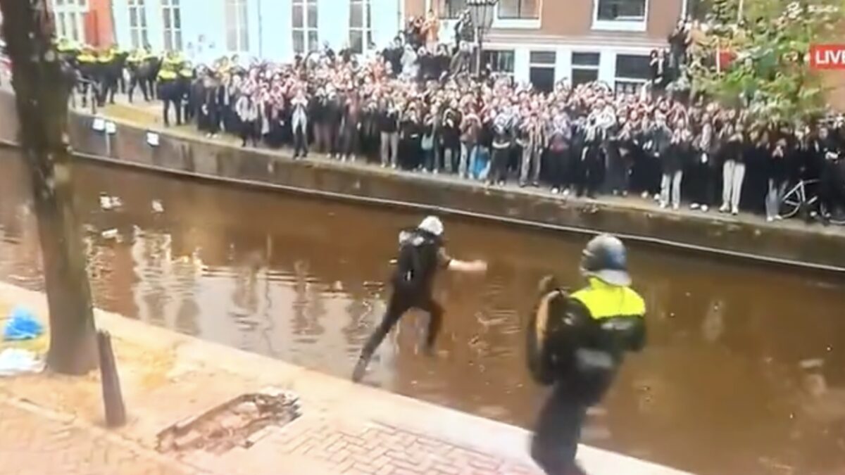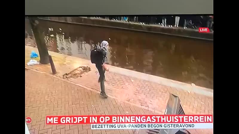 Op dit moment wordt het Binnengasthuisterrein dat door pro-Palestijnse demonstranten bezet wordt, door de ME leeg geveegd en één aanhanger koos toch eieren voor zijn geld door de gracht in te springen.