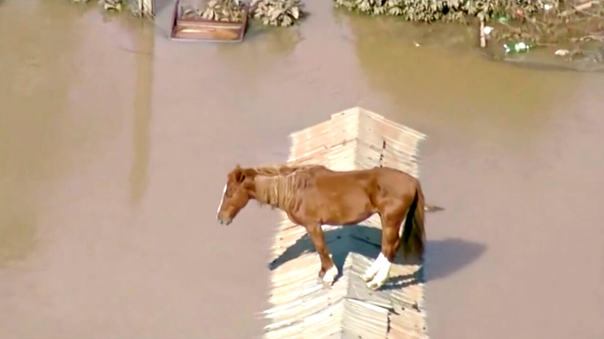 In Brazilië heeft een helikopter een paard vastgelegd dat op een dak zijn toevlucht had gezocht. Het paard probeerde te ontkomen aan de overstromingen die het gebied treffen. Lokale inwoners zijn erin geslaagd het paard en andere dieren te redden.