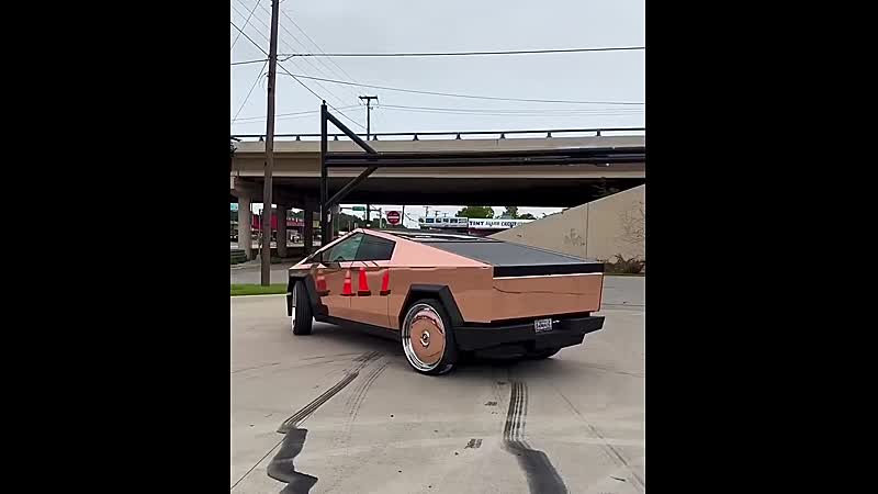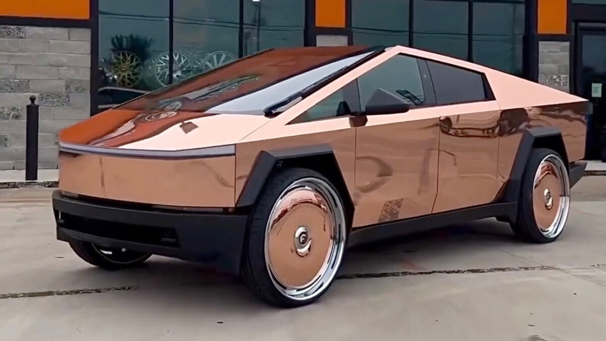 Iemand heeft zijn Cybertruck rosé goud gewrapped met bijpassende 30 inch wielen