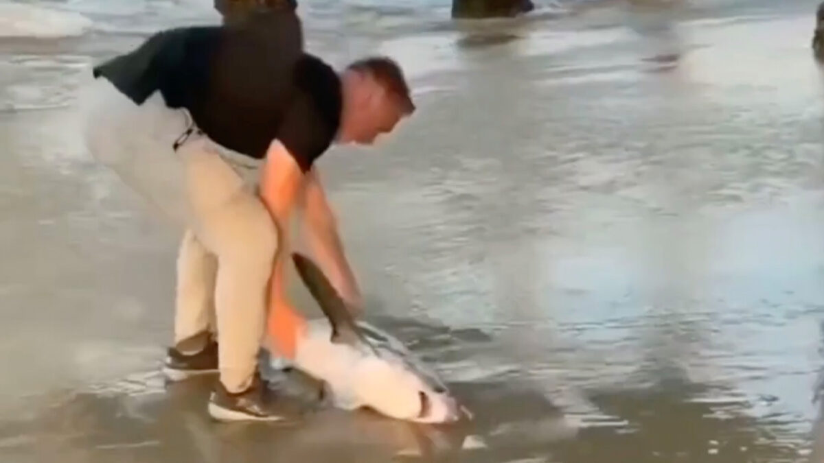 Man helpt een aangespoelde haai met zijn blote mannenklauwen terug in zee