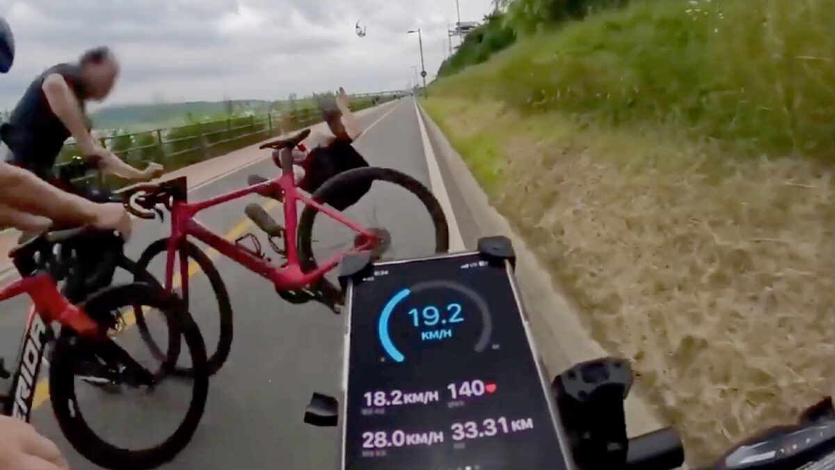 Het lijkt alsof de fietser naar beneden kijkt omdat 'ie misschien wat vreemds aan zijn fiets hoort, met als gevolg dat 'ie ineens in het midden van de weg rijdt en deze wielrenners hem niet meer kunnen ontwijken.