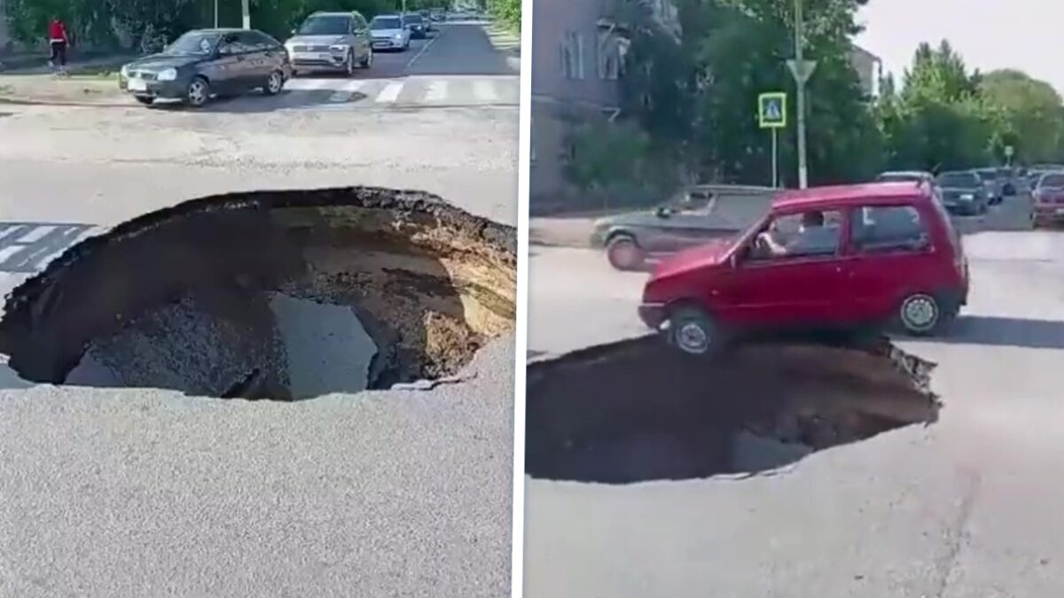 In het Russische Oerjoepinsk ontstond een enorm sinkhole in een van de weinige asfaltwegen. Geen kleintje, maar toch wist een automobilist dat volledige ding over het hoofd te zien.
