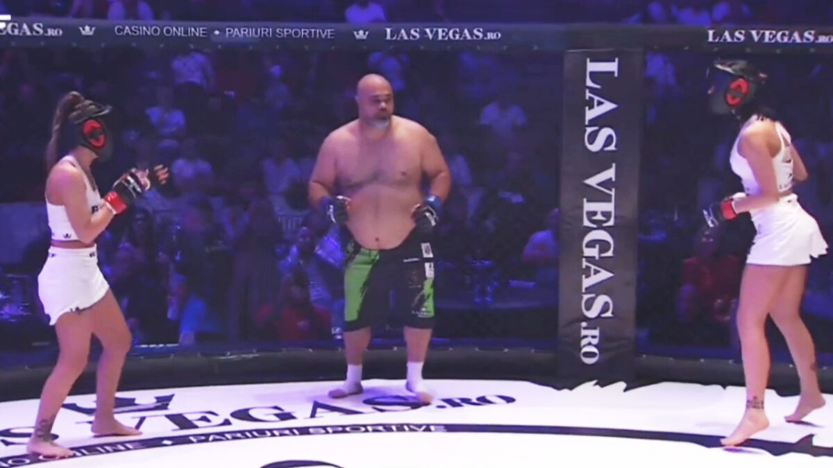 Nu weten we best dat er in de vechtsport allemaal gewichtsklassen bestaan, maar in Roemenië nemen ze het daar niet zo nauw mee. Daar zetten ze gewoon twee vrouwen tegenover één man en alhoewel je dan qua gewicht misschien wel redelijk in balans bent verloopt het gevecht niet helemaal eerlijk. MMA-er Perversu nam het namelijk op tegen het duo Roxana en Bettyshor en alhoewel die dapper weerstand bieden zijn ze eigenlijk geen partij.