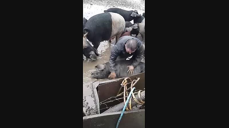 Deze varkensboer is 5 minuten bezig geweest om dit varken van de verdrinking te redden nadat hij het dier in een waterreservoir vond. Lekker gewerkt pik, hebben we tenminste morgen iets voor aan het spit...