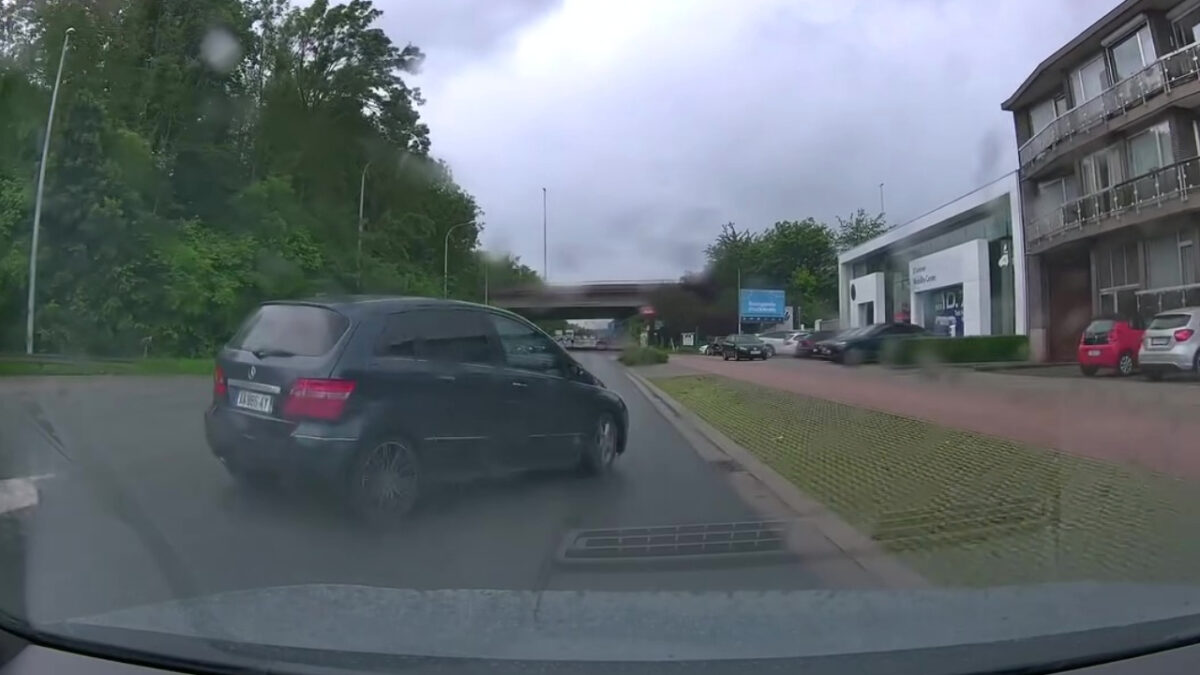 Autorijden is anticiperen en dus een beetje voor je uit kijken zodat je weet wat je medeweggebruikers allemaal van plan zijn. Ook in België, al had één bestuurder die memo gemist. Van schrik lijkt hij zijn auto in de berm te gooien om de toeterende bestuurder te laten passeren, of moest 'ie daar gewoon toevallig zijn auto parkeren?
