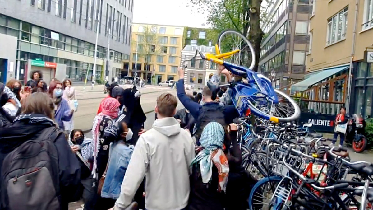 Een groep pro-Palestinademonstranten krakers blokkeerde gisteren een straat vlakbij de Roeterseilandcampus van de UvA in Amsterdam. Niemand mocht er langs, maar daar had niet iedereen een boodschap aan.