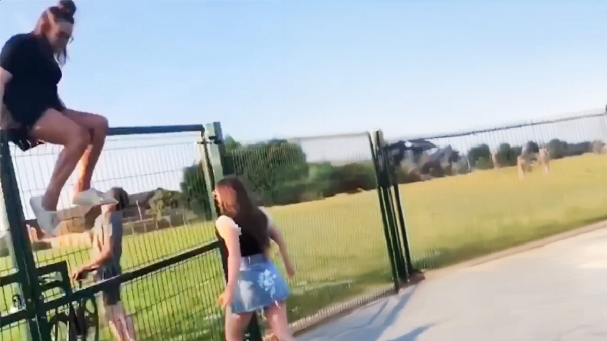 Deze dame dacht even over een hekje te klimmen, maar dat verliep niet geheel volgens plan. Datzelfde hek besloot namelijk wraak te nemen door haar de wedgie van haar leven te bezorgen.