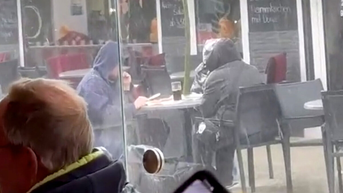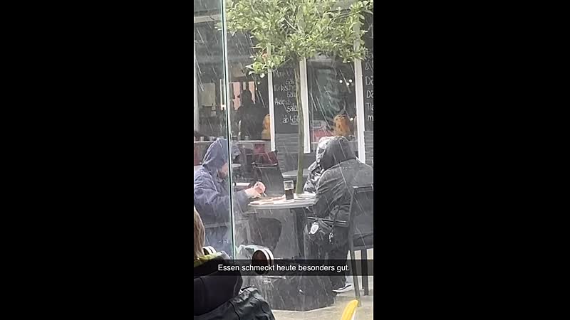 Wij krijgen volgende week eindelijk zomers weer, en we tikken misschien wel de 30 graden aan, maar in Duitsland is het weer voorlopig nog behoorlijk treurig. Deze Duitsers zijn er he-le-maal klaar mee en besluiten gewoon in de stromende regen te lunchen.