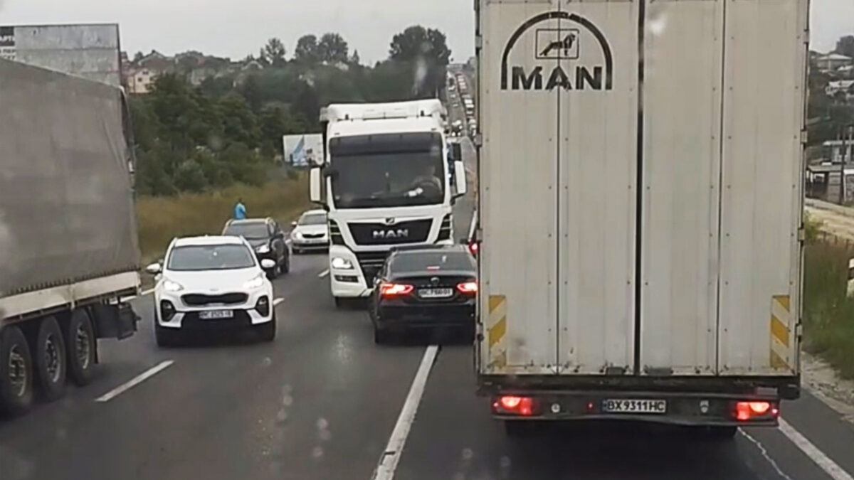 Asociale automobilist wil file wil ontwijken maar wordt klemgereden door vrachtwagenchauffeur