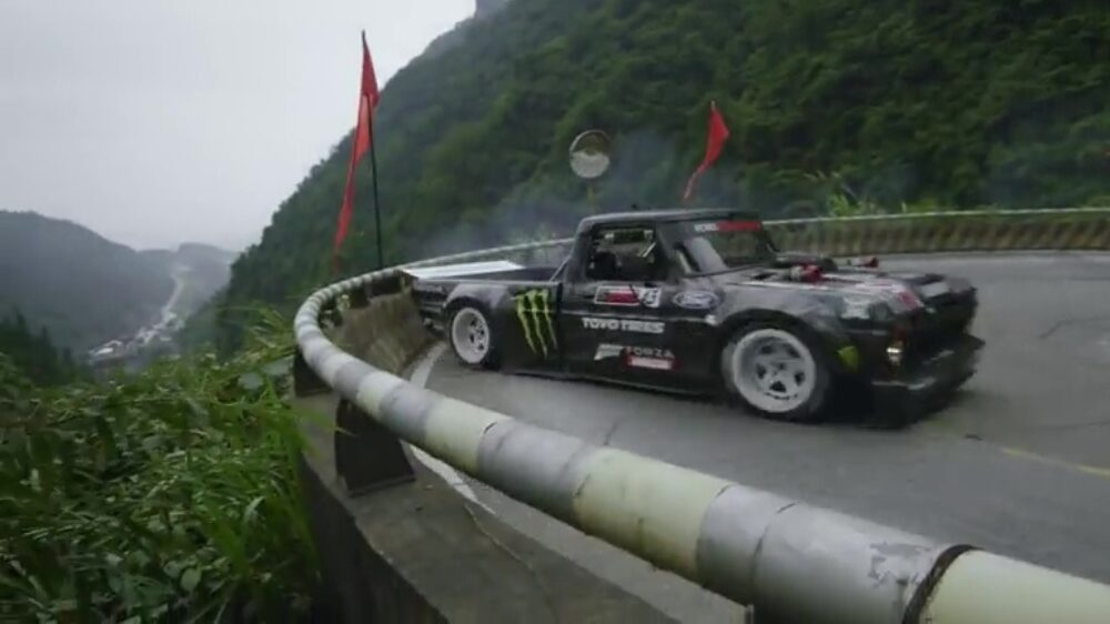 Ken Block drift er op los op China's gevaarlijkste weg tijdens Climbkhana