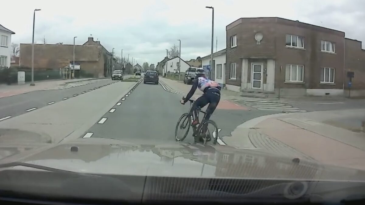 Zo ook de volgende man op een racefiets ergens in België. Hij wil blijkbaar naar de andere kant van de weg en maakt een afslaande beweging. Automobilist is alert en remt op tijd, maar vraagt zich terecht af wat de fietser in hemelsnaam aan het doen is. Als bedankje krijgt hij blijkbaar buiten beeld nog een vriendelijke middelvinger van de wielrenner.
