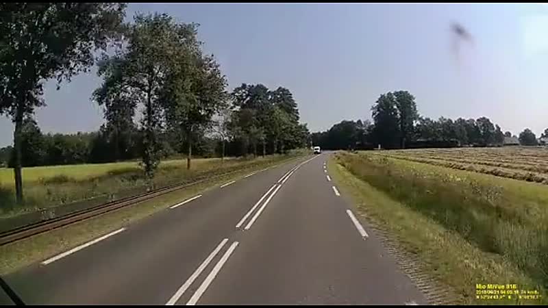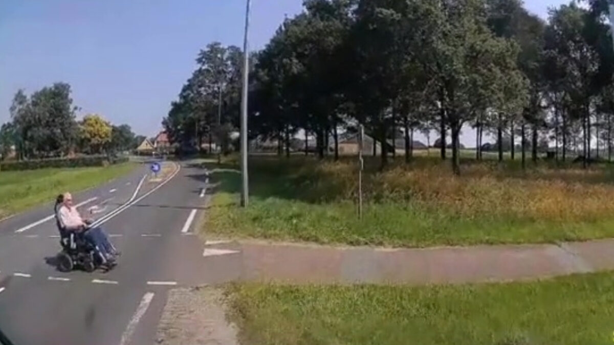 Een elektrische rolstoel heeft een snelheid van 5 tot 10 km/uur. Hard gaat het dus niet, maar een gemiddelde voetganger race je er met gemak uit. Oversteken zou dus ook prima moeten lukken, maar deze elektrische straatduivel zat waarschijnlijk nog met zijn gedachten bij de bingo, waardoor de oplettende vrachtwagenchauffeur moest uitwijken naar de berm. Iemand zijn opa kwijt toevallig?
