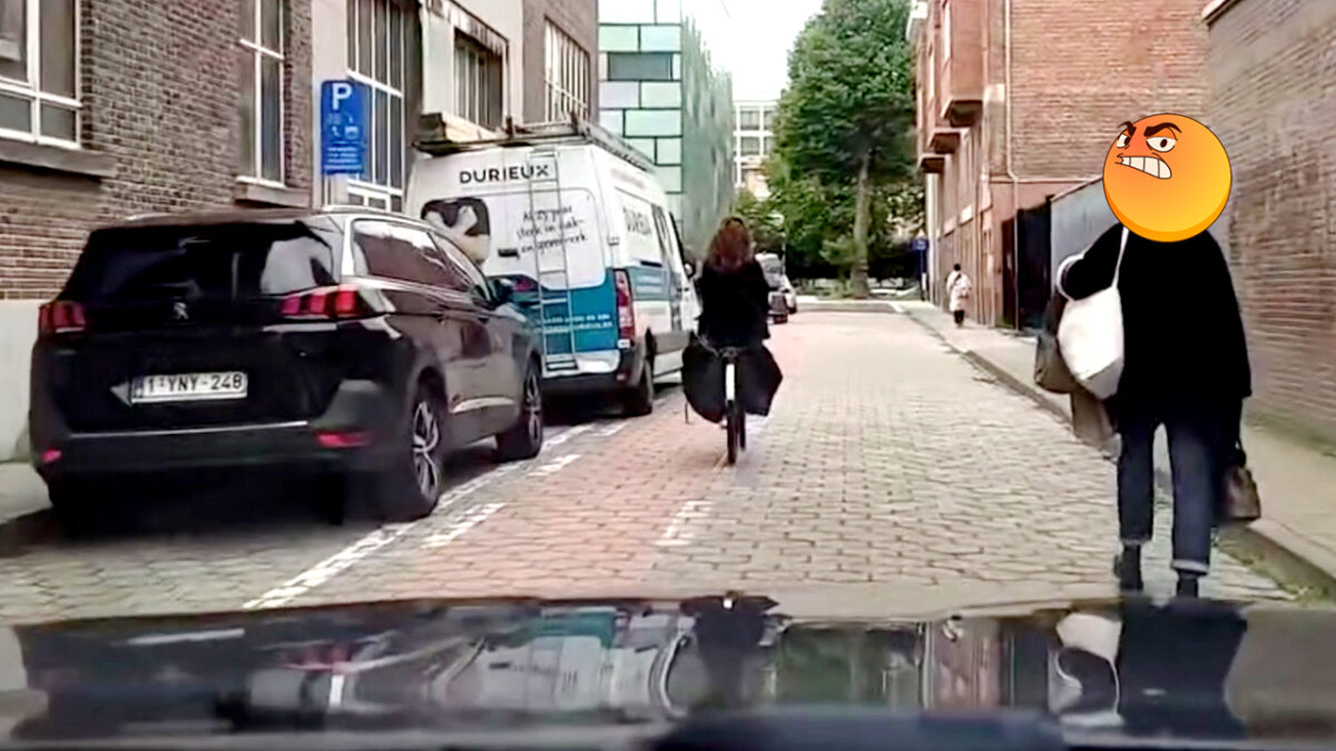 Voetganger in Gent vertikt het om op de stoep te lopen en kijkt geïrriteerd naar dashcammer