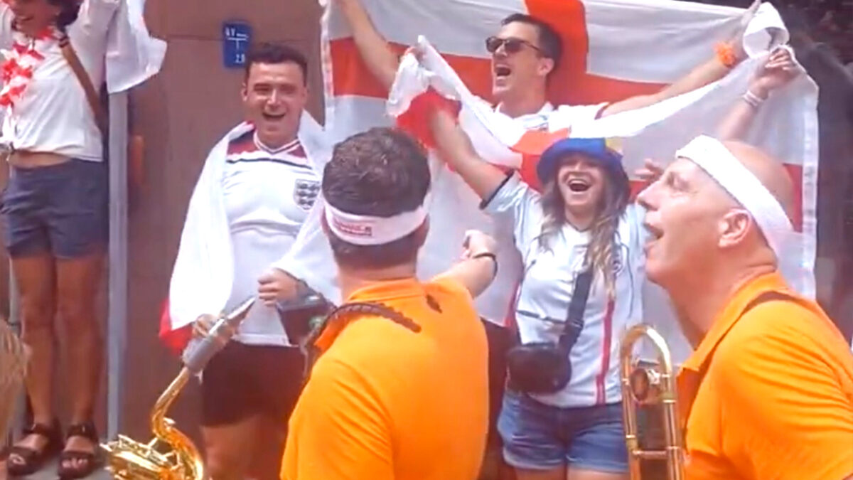 Vrienden en vijanden worden vandaag toegezonden door het Oranjelegioen in Dortmund dus ook deze Engelse supporters worden op een stukje "Hey Jude" getrakteerd.