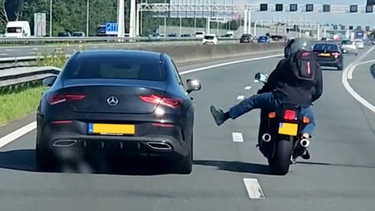 Wat er precies aan dit moment is voorafgegaan zal waarschijnlijk niet al te chique geweest zijn, maar dat deze motorrijder heel graag een afslagje wil pakken om het even goed "uit te spreken" met de bestuurder van deze Mercedes moge duidelijk zijn.