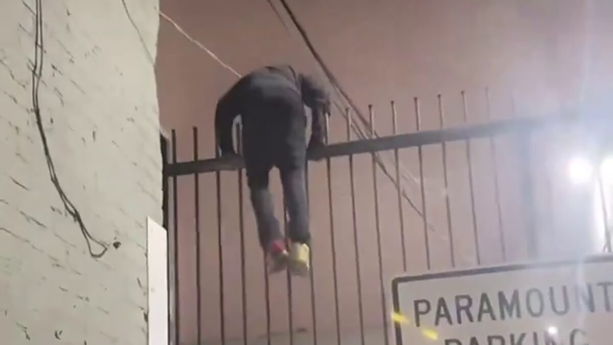 Een ietwat onhandige automobilist probeert over een hek te vluchten nadat hij meerdere auto's heeft geramd. Helaas voor hem verloopt zijn ontsnappingspoging niet zoals gepland en blijft zijn skinny jeans (wie draagt dat überhaupt nog?) achter het hek hangen.