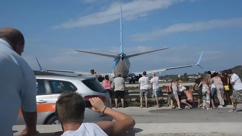 Toeristen laten zich vrijwillig zandstralen achter een Boeing op het Griekse eiland Skiathos