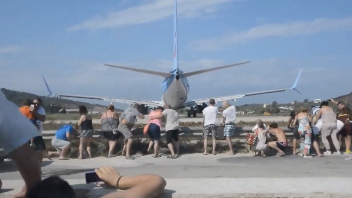 Toeristen laten zich vrijwillig zandstralen achter een Boeing op het Griekse eiland Skiathos