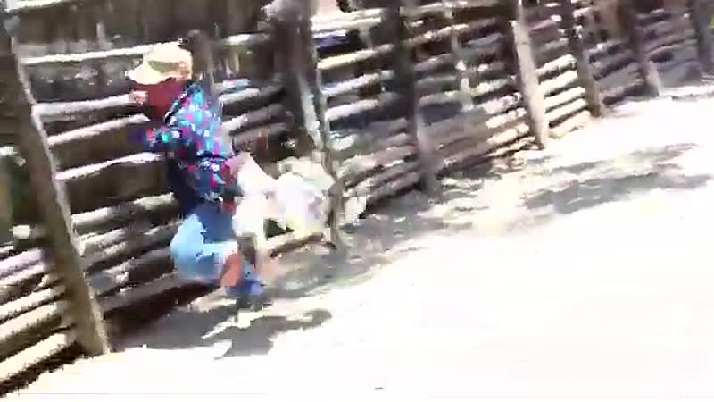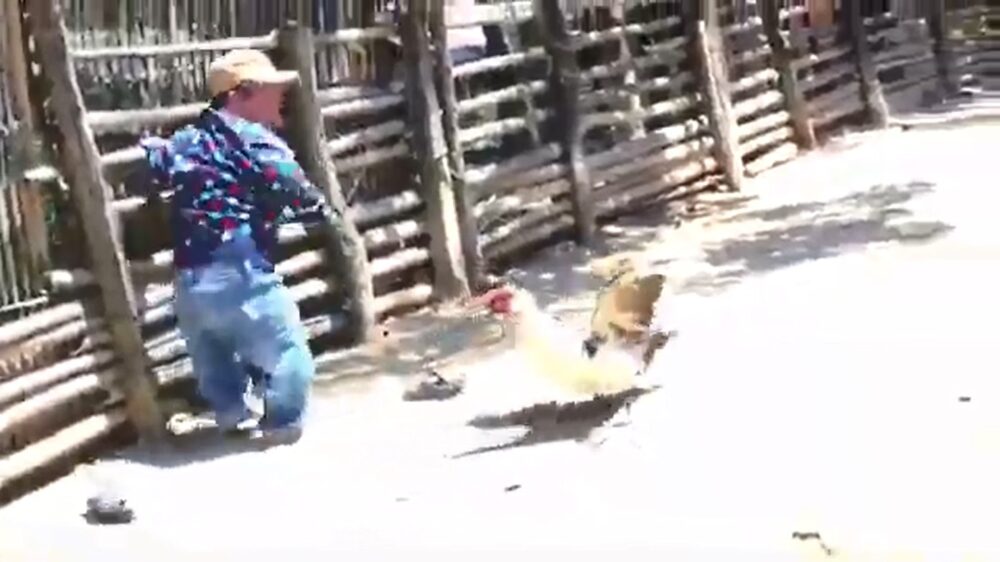 Of is het misschien gewoon iemand met een normaal postuur die wordt aangevallen door een hele grote kip?