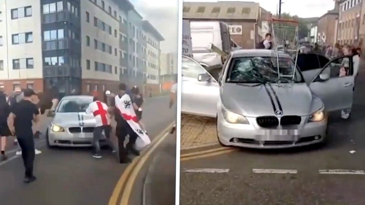 Op het internet gaan bizarre beelden rond van de rellen. Zo zagen we eerder hoe een (tegen)demonstrant relschopper een zwaard (!) mee de straat op nam. Nu circuleren er ook beelden van een onmenselijke aanval op een stel Aziatische inzittenden van een BMW in Hull. Het voertuig werd omsingeld door een woedende meute, die op de auto beukte en de passagiers belaagde. Op beelden is te zien hoe één inzittende wegrent, terwijl hij wordt achtervolgd door een relschopper.