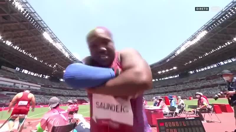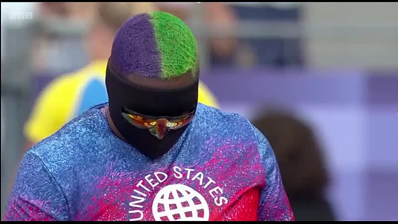 The colourful character of Raven Saunders back. Good to see her back, sort of. Sort of see her, I mean. Well, we can't see them very well. Raven Saunders is actually non-binary. And wearing the mask there, we're quite used to seeing them with interesting attire. Is that your head? Why not? Why not indeed?