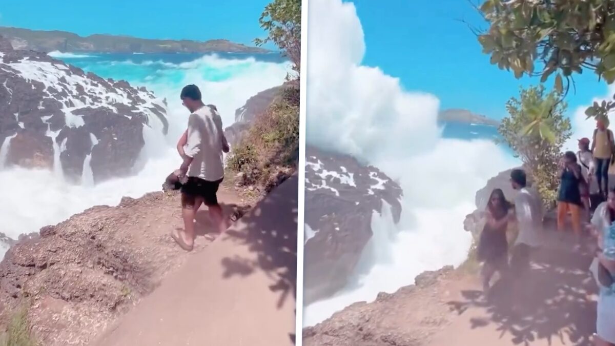 Enorme onverwachte golf in Bali verrast groep toeristen