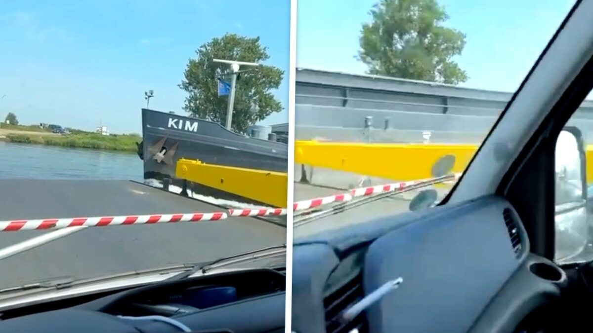 Veerboot met auto's geramd door vrachtschip dat in volle vaart van rechts komt