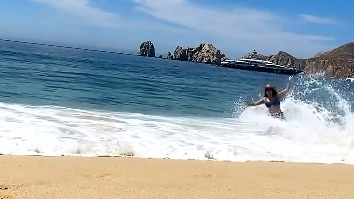 Vloedgolf verpest veelbelovende vakantievideo en sleurt haar telefoon de zee in
