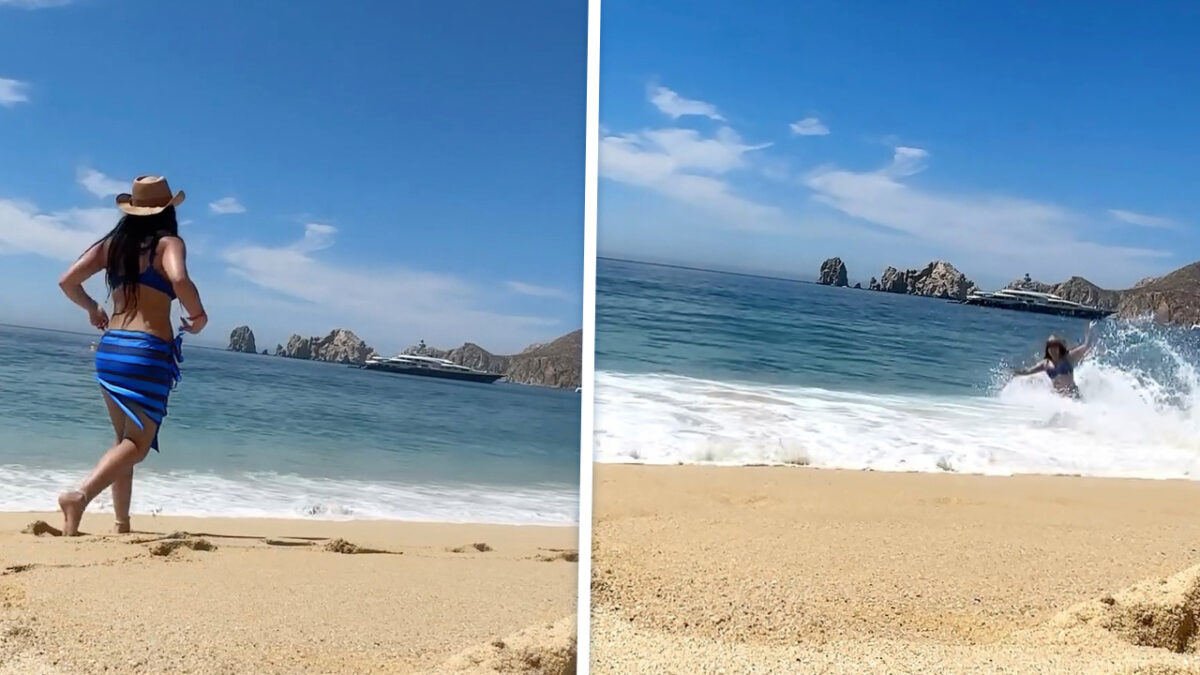 Vloedgolf verpest veelbelovende vakantievideo en sleurt haar telefoon de zee in